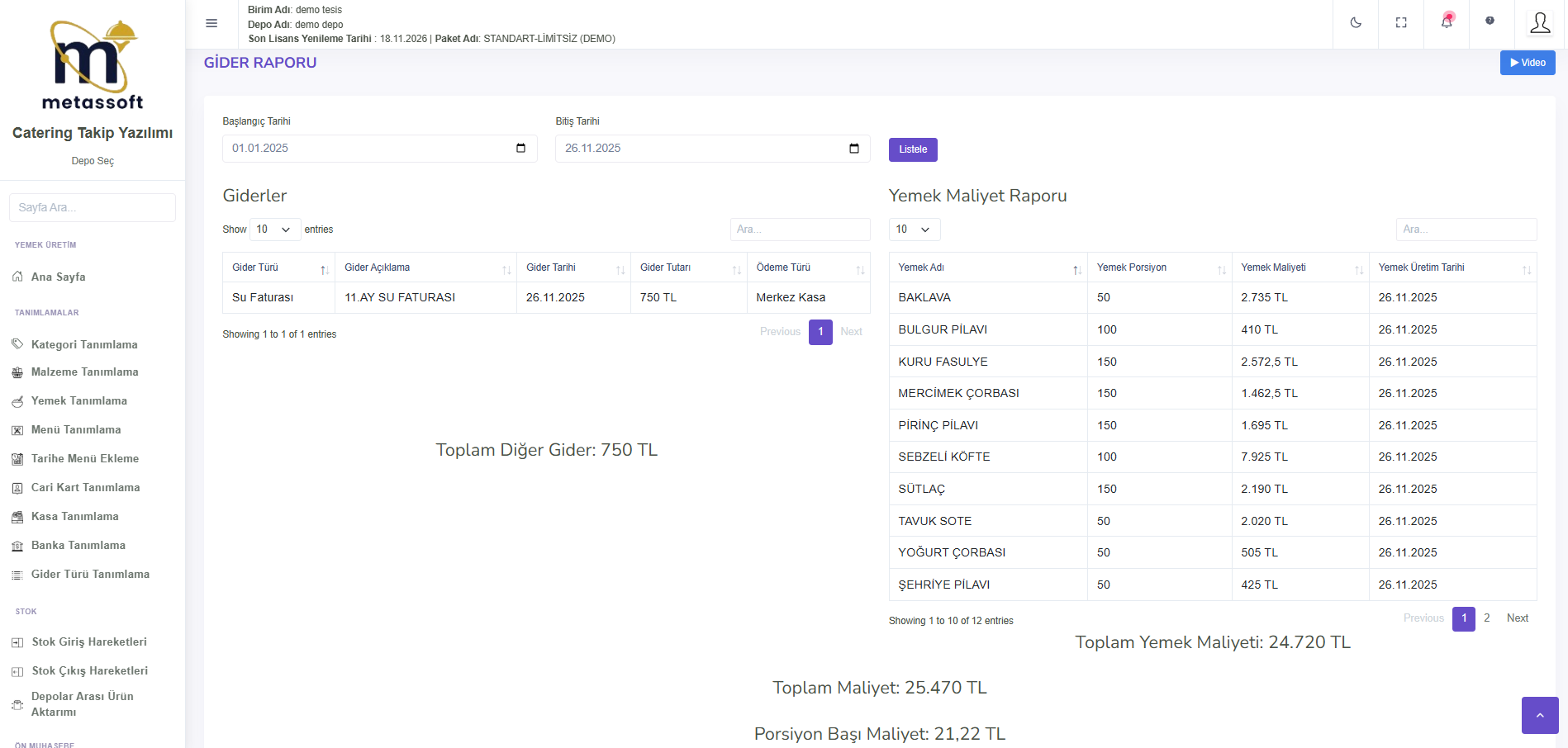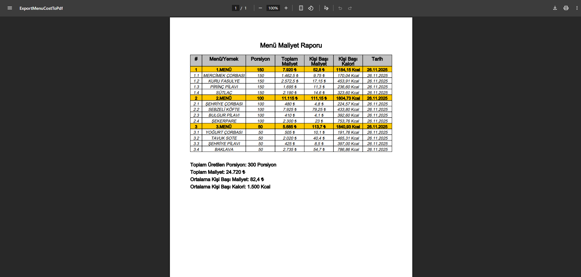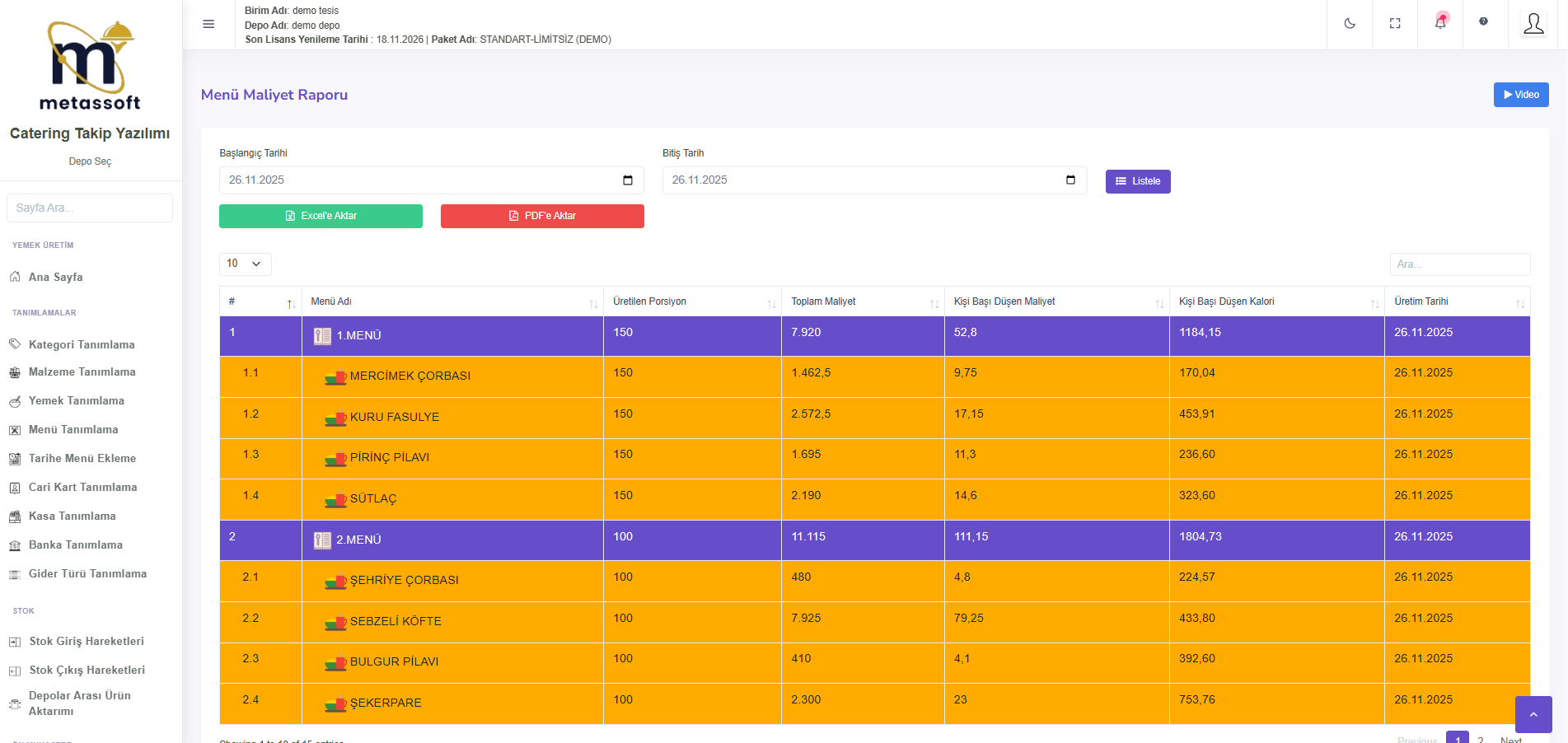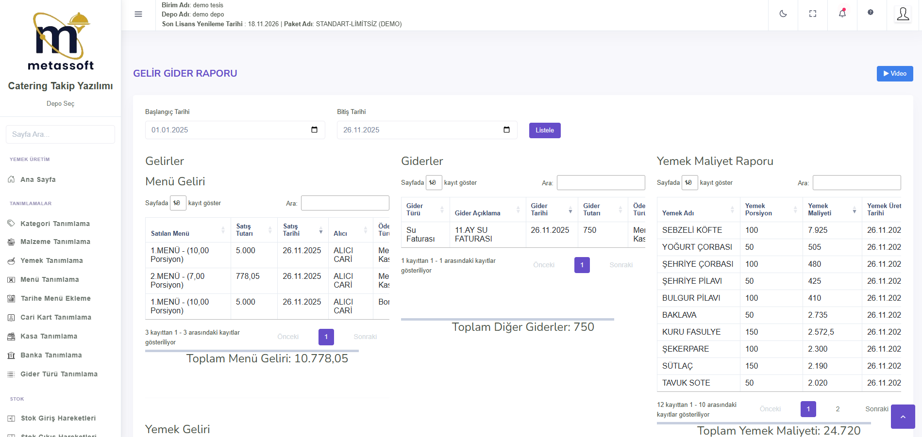 Menü Maliyet Raporu, seçilen tarihte üretilen menülerin maliyetlerini detaylı şekilde inceleyerek maliyet analizine yardımcı olur. Yemek Maliyet Raporu, üretilen yemeklerin maliyetlerini ayrıntılı olarak gösterir. Banka ve Kasa Hareketleri raporu, giren ve çıkan paraları ve toplam tutarı göstererek tüm finansal hareketleri satır satır listeler.
