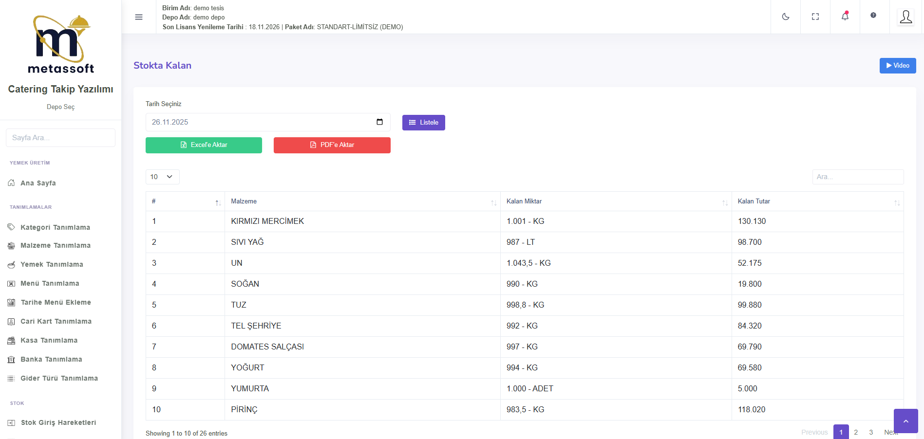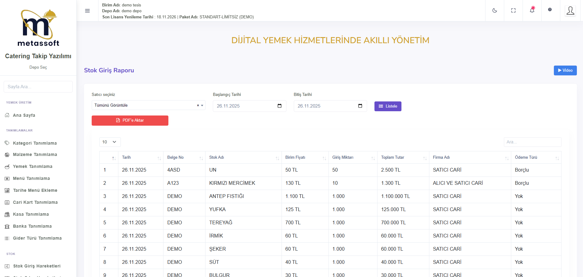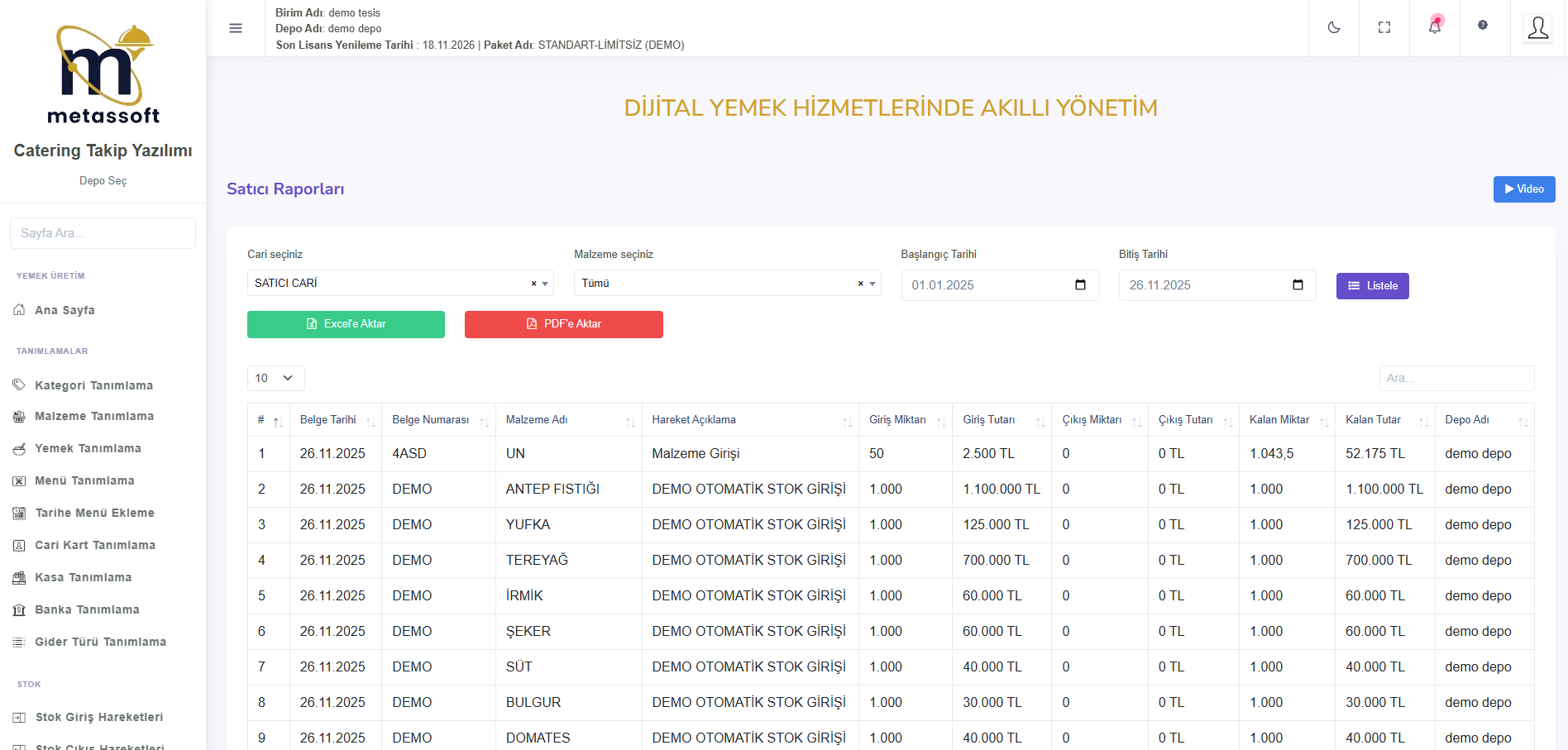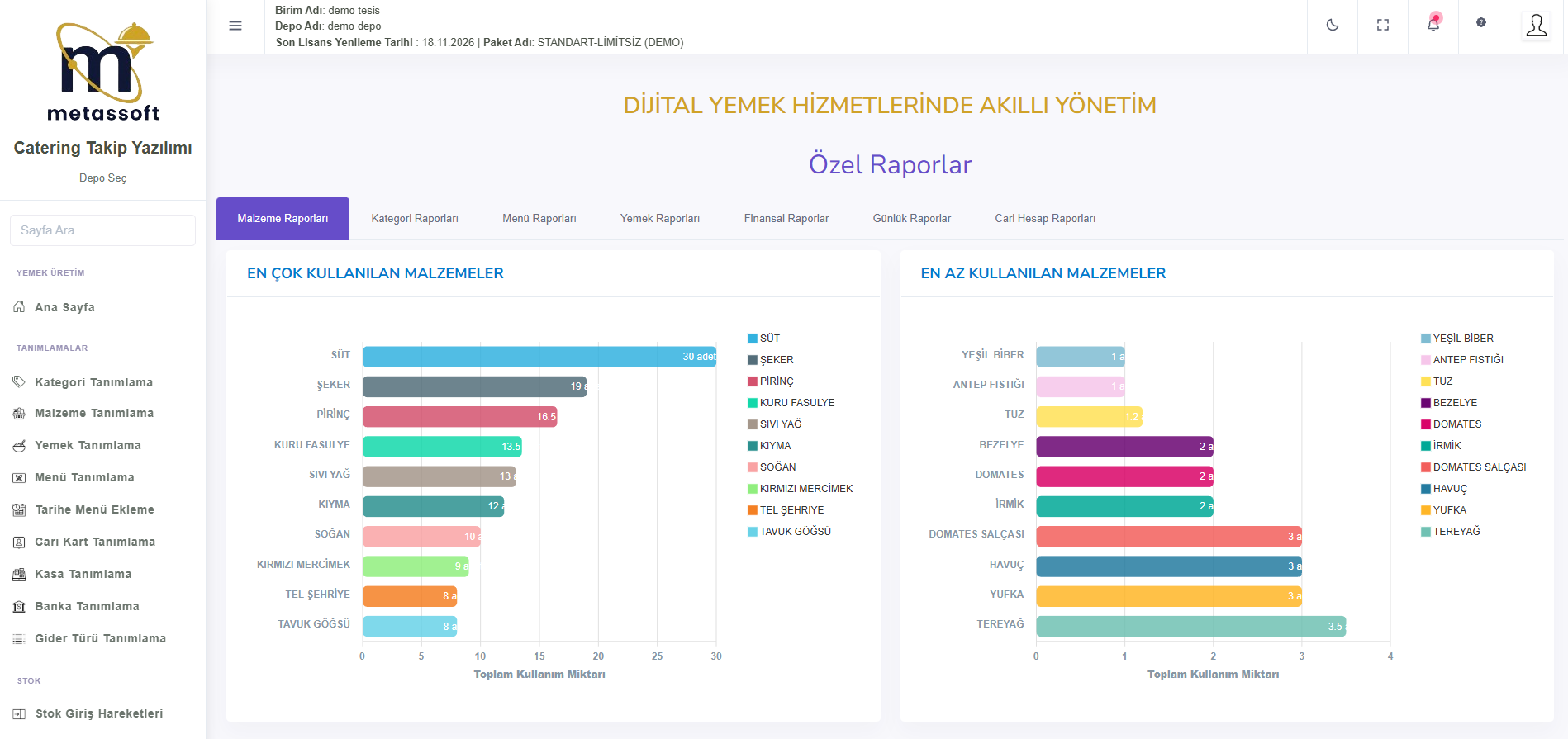 Ambar Defteri raporu, ürünlerin belirli tarihler arasındaki hareketlerini göstererek depodaki ürün akışını takip etmeye olanak tanır. Stokta Kalan raporu, belirli bir tarihte kalan ürünleri listeleyerek stok seviyelerini denetler. Satıcı Raporları, satıcılardan alınan ürünlerin, fiyatlarının ve alım tarihleri gibi detayları gösterir. Satış Raporu ise alıcılara yapılan satışları, kaç porsiyon yemek veya menü satıldığını ve toplam satış tutarını gösterir.