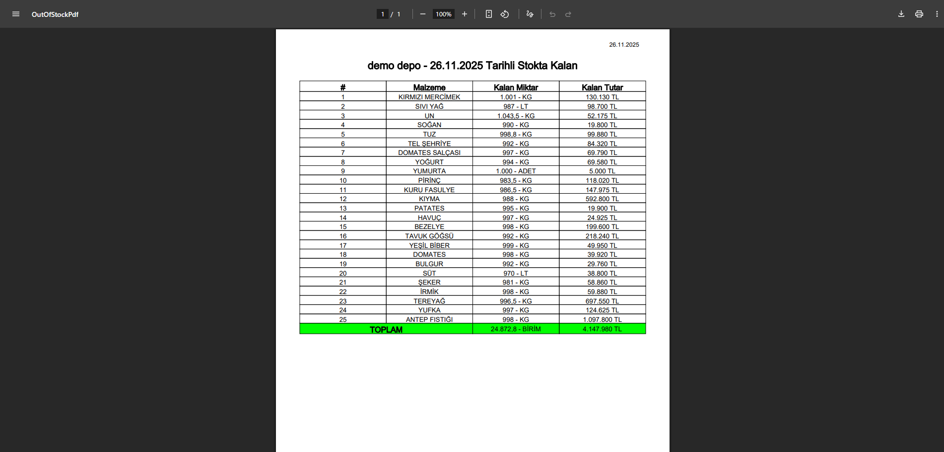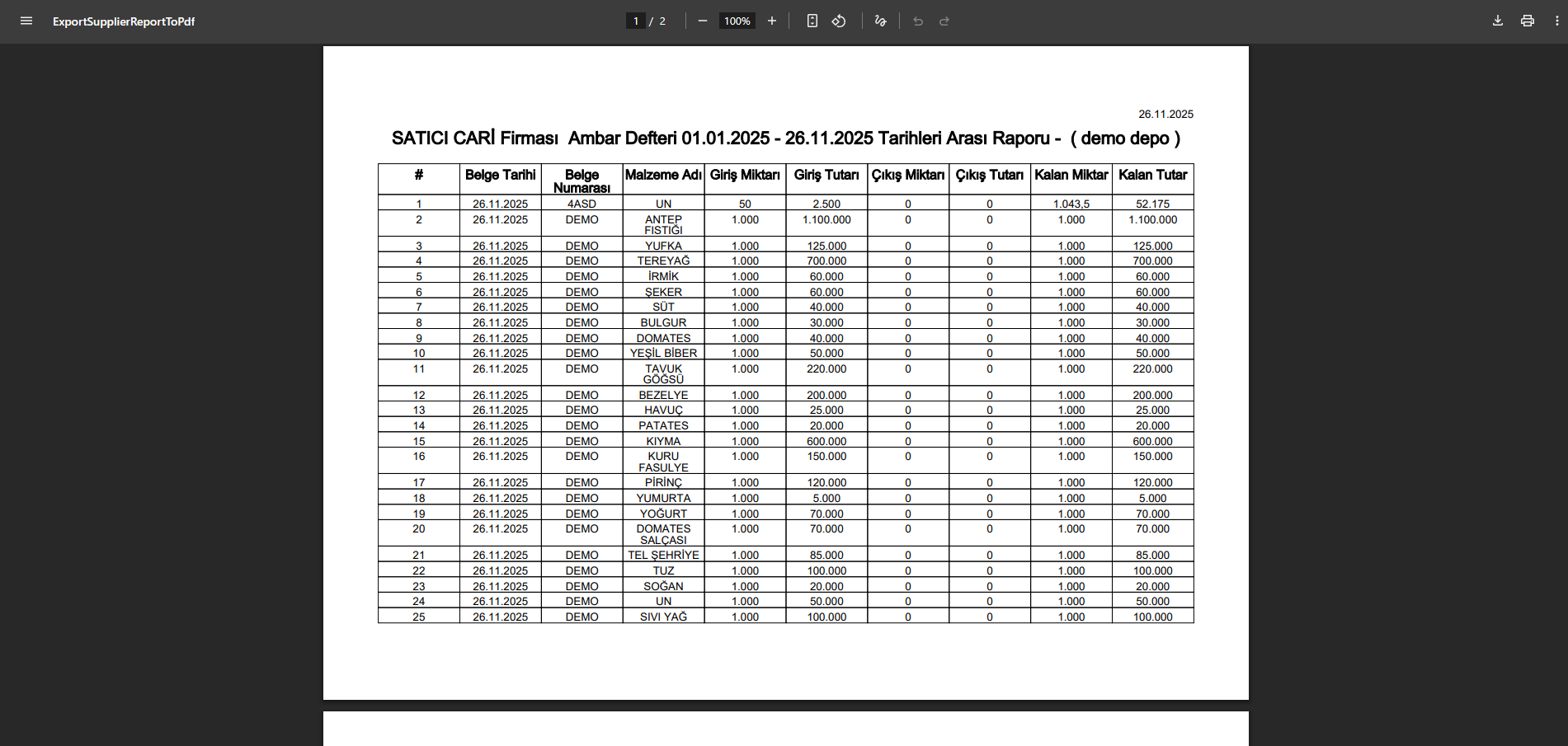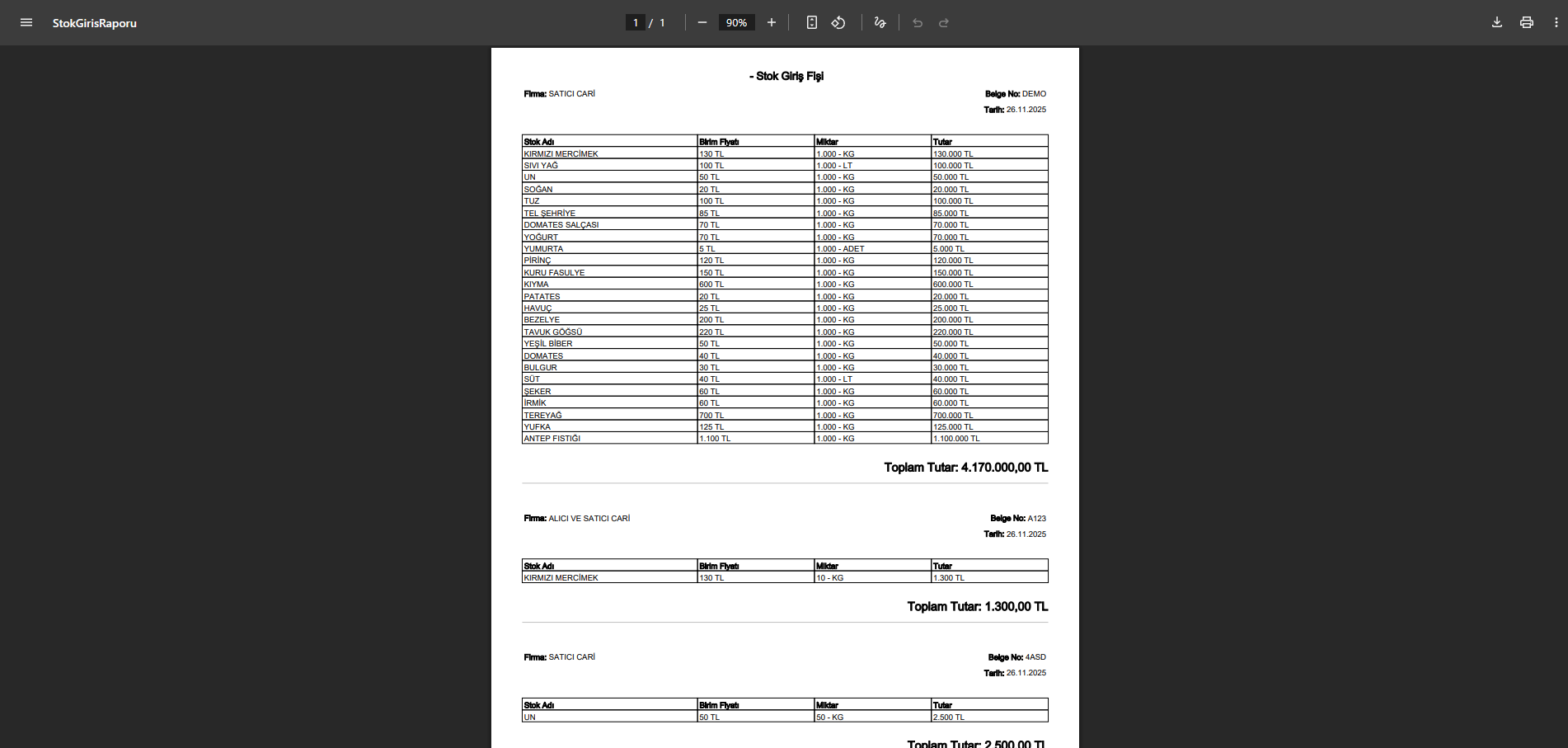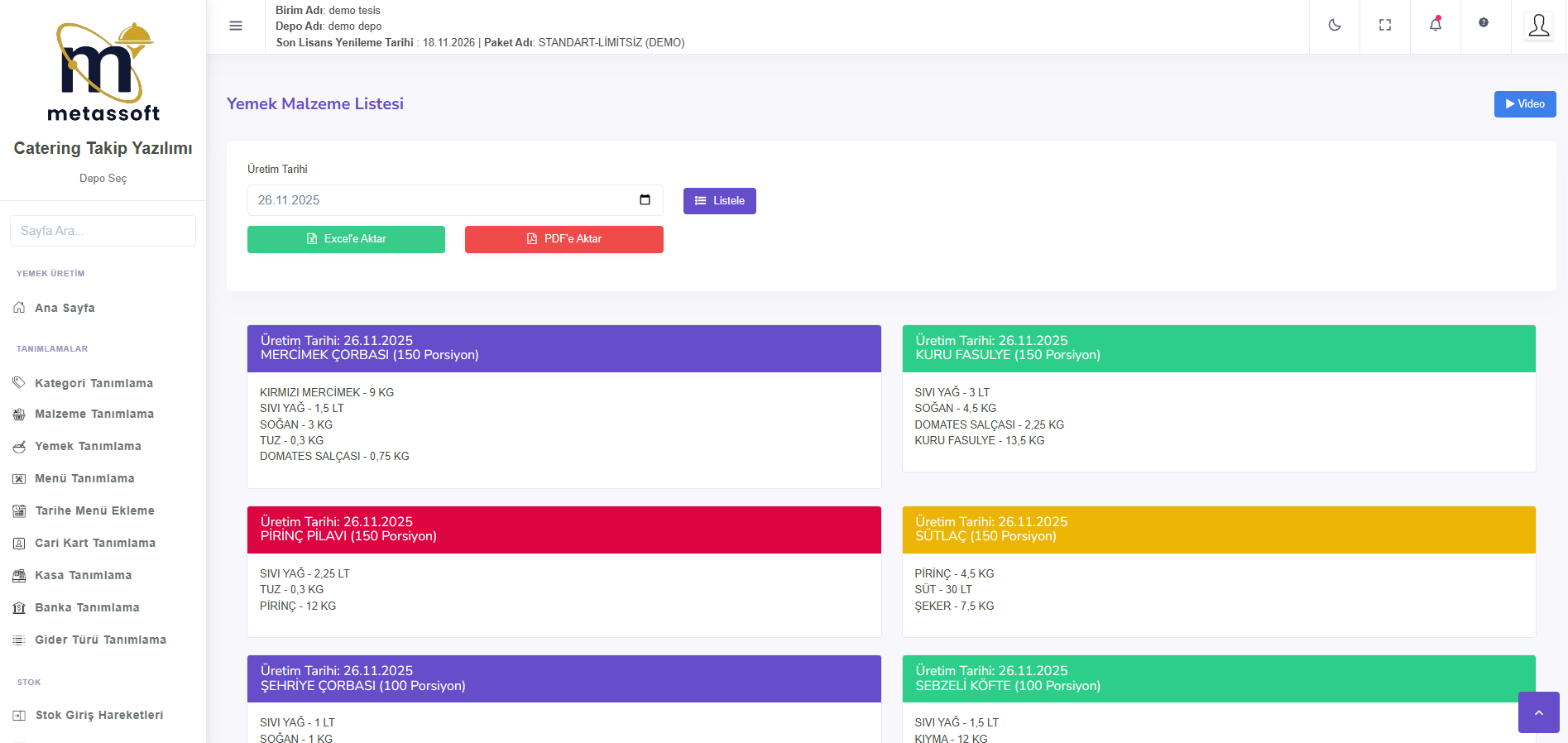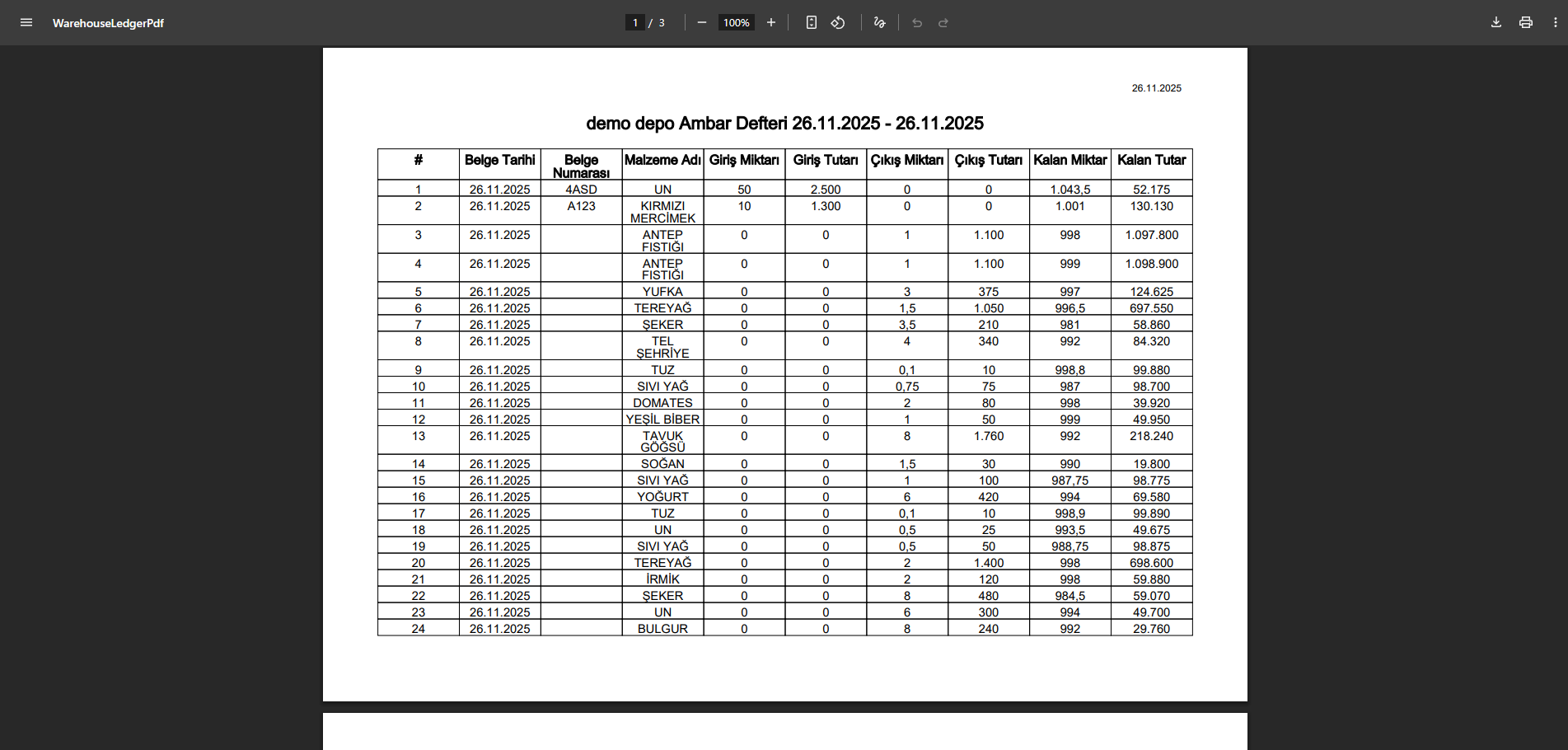 Ambar Defteri raporu, ürünlerin belirli tarihler arasındaki hareketlerini göstererek depodaki ürün akışını takip etmeye olanak tanır. Stokta Kalan raporu, belirli bir tarihte kalan ürünleri listeleyerek stok seviyelerini denetler. Satıcı Raporları, satıcılardan alınan ürünlerin, fiyatlarının ve alım tarihleri gibi detayları gösterir. Satış Raporu ise alıcılara yapılan satışları, kaç porsiyon yemek veya menü satıldığını ve toplam satış tutarını gösterir.