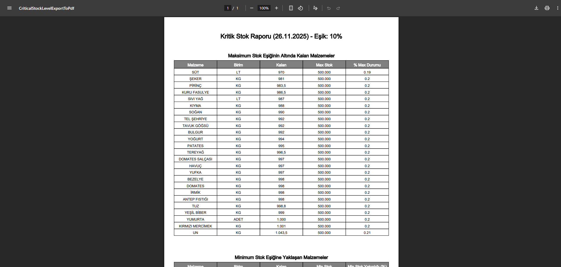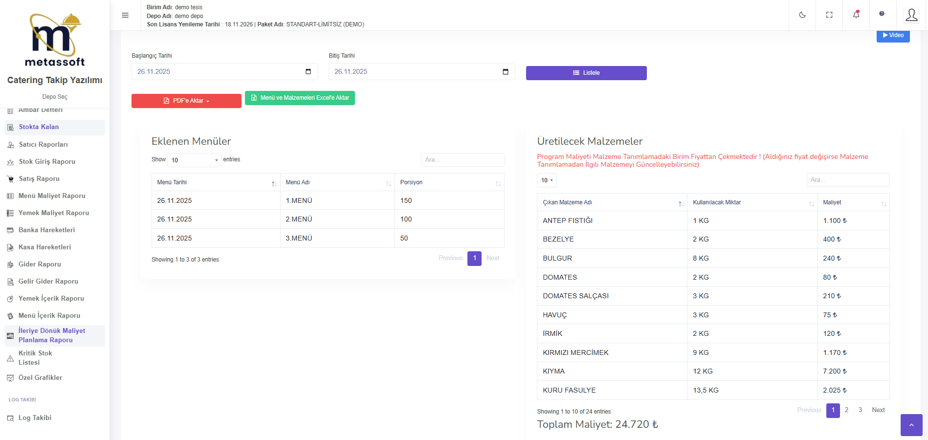 Son olarak, İleriye Dönük Maliyet Planlama Raporu, menü ekleme sayfasında tanımlanan menüler doğrultusunda, henüz üretilmeden önce tahmini malzeme kullanımı ve maliyet hesaplaması yaparak gelecekteki maliyet planlamalarını sağlar.